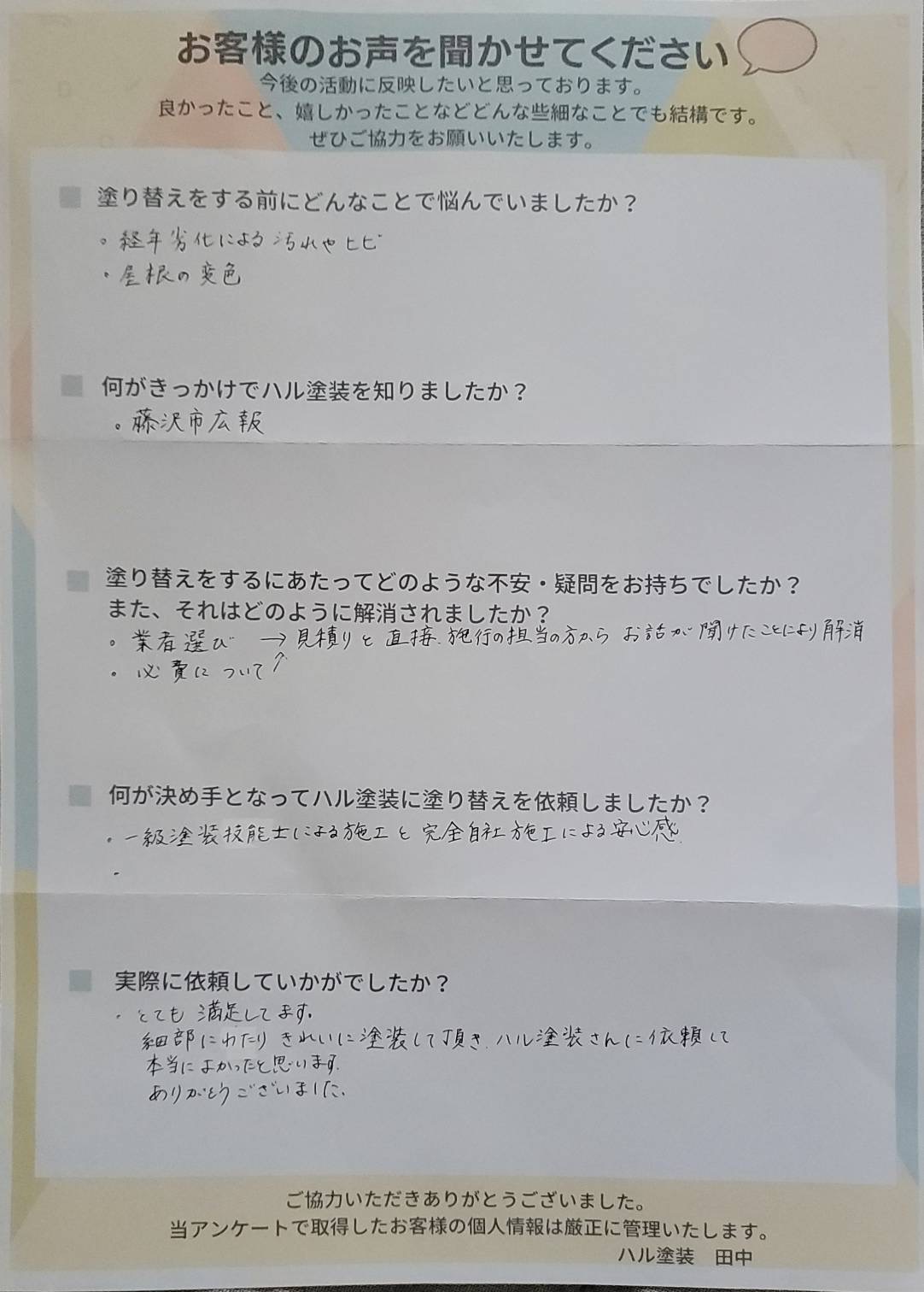 Nさま「広報ふじさわ」でふと目についたハル塗装さん。お見積もりいただき、塗装の種類や塗り方などの質問に丁寧に説明してくださり、疑問が解消されました。ハル塗装さんはすべて完了してからのお支払いで良いと言ってくださり、安心してお任せしようと思いました。