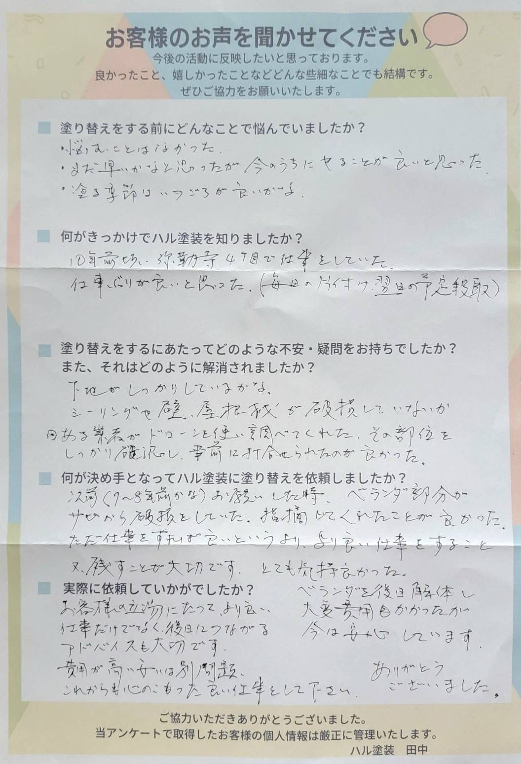 お客様の声アンケート用紙が届きました。 •悩むことはなかった •まだ早いかなと思ったが、今のうちにやることが良いと思った。 •塗る季節はいつごろが良いかな。 10年前頃、弥勒寺4丁目で仕事をしていた。 仕車ぶりが良いと思った。(毎日の片付け、翌日の...
