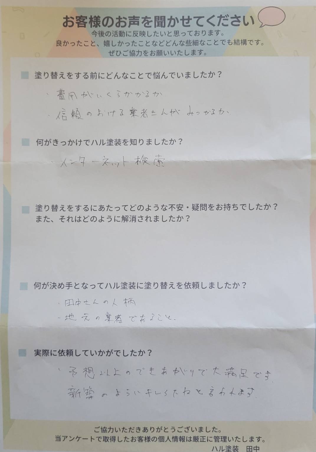 お客様の声アンケート用紙が届きました。 ・費用がいくらかかるか ・信頼のおける業者さんがみつかるか、 ・インターネット検索 ・田中さんの人柄 ・地元の業者であること。 ・予想以上のできあがりで大満足です。 新築のようにキレイだねと言われます。 T... -