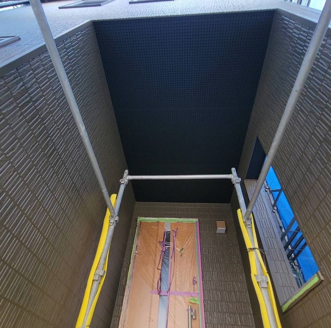 ただいま施工中の軒天井を吹き付けで仕上げました。 玄関前の天井施工前です。 施工前1施工前2 ごく普通の天井だと思いますが、 よく見ると穴が空いてます。 通気性を良くする為の穴で、 ローラで塗ってみるとこんな感じになります。 キャー😱😱奥が丸見え...