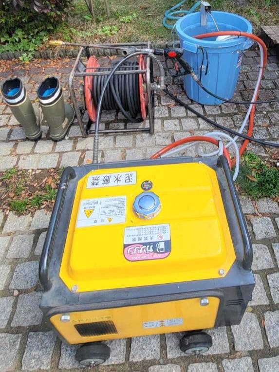 足場組立工事も無事に終わり、 水洗い作業を行いました。 ハル塗装で使用している高圧洗浄機になります。 防音タイプで150気圧のパワーがあります。 ノズルの先端を変えると、更にパワーアップして、屋根の苔、床、タイルなど頑固な塀の汚れなども根こ... -