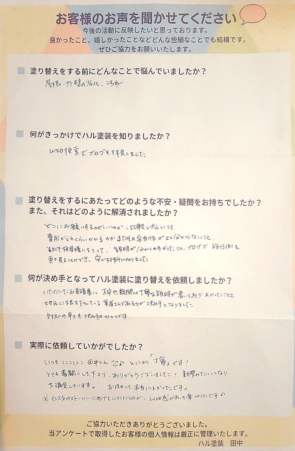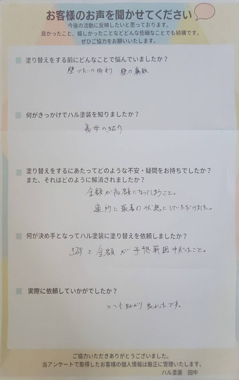 お客様様の声アンケート用紙が届きました。 壁づたいの雨もり. 壁の腐敗 義母の紹介 金額が高額になってしまうこと。 適所に最善の状態にしていただけました。 紹介 と金額が予想範囲中だったこと。 とても助かり 良かったです。 ご協力いただきありがとう... -