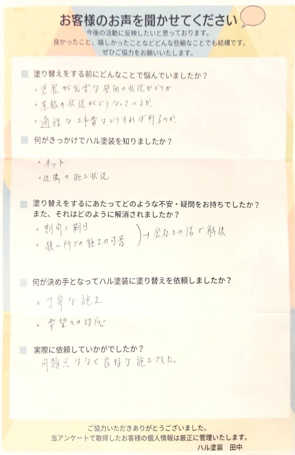お客様の声アンケート用紙が届きました。 ・塗装が必要な壁面の状況かどうか。 ・屋根の状況がどうなっているか。 ・適性な工事費はどうすれば判るのか。 ・ネット ・近隣の施工状況 期間と期日 狭い所での施工の可否 →会社との話で解決 ・丁寧... -