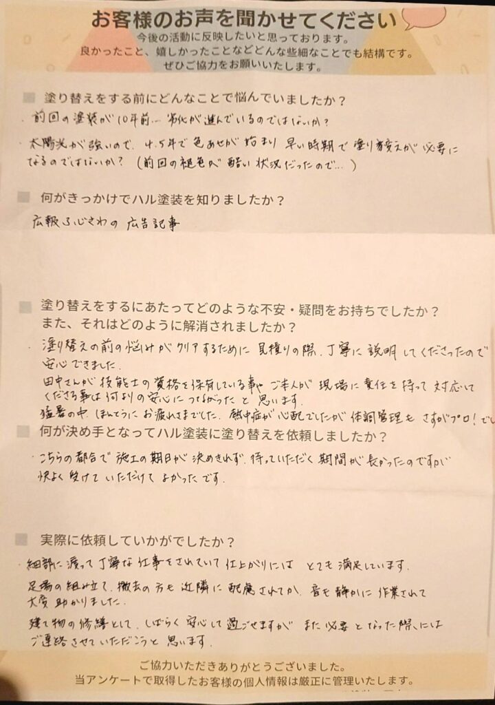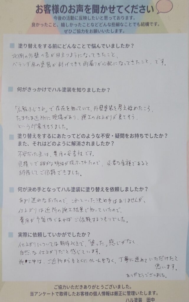 お客様の声 アンケート用紙が届きました。 北側の外壁の苔が目立つようになってきたこと、 ベランダ床の塗装が剥げてきて雨漏りが心配になってきたことです。 「広報ふじさわ」で存在を知っていて、外壁塗装を考え始めたころ、 たまたま近所に現場があり、... -