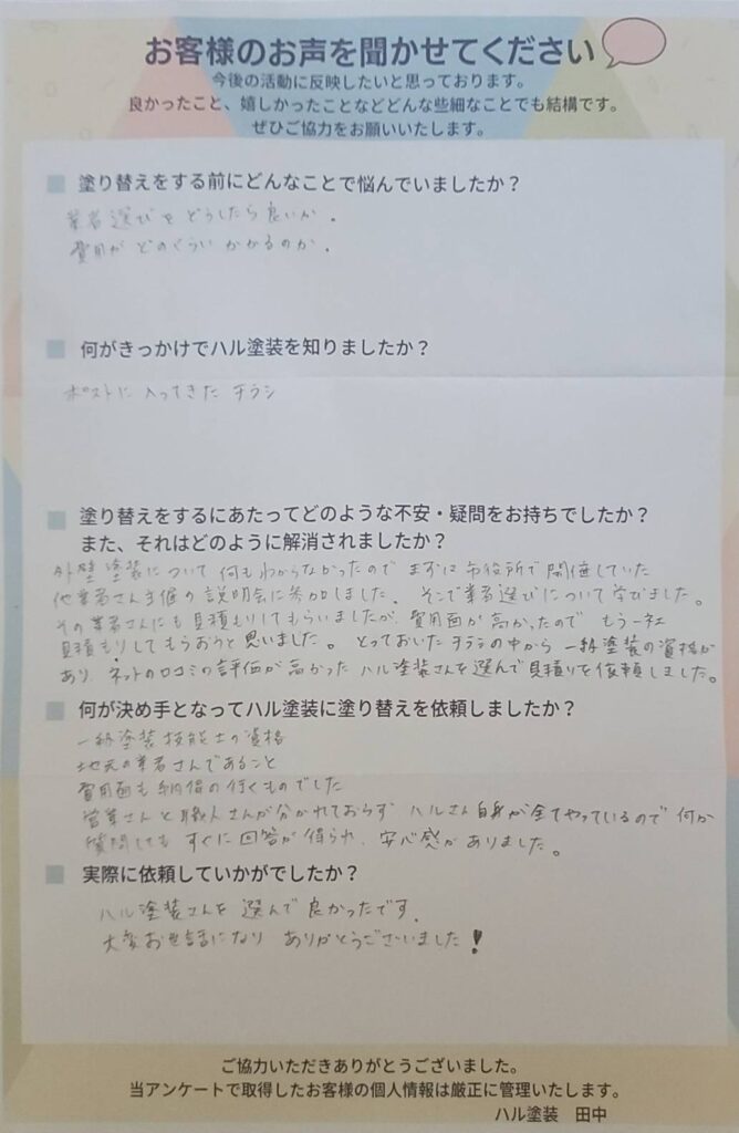 お客様の声アンケート用紙が届きました。 ・塗装が必要な壁面の状況かどうか。 ・屋根の状況がどうなっているか。 ・適性な工事費はどうすれば判るのか。 ・ネット ・近隣の施工状況 期間と期日 狭い所での施工の可否 →会社との話で解決 ・丁寧...