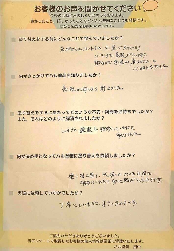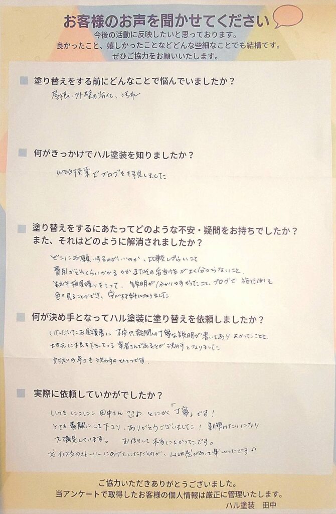 お客様の声アンケート用紙が届きました。 費用や塗料の選定。 インターネット 費用や第一級塗装士であること。 仕上がりに満足している パイプなどの固定をしてもらえて助かりました。 T様この度はアンケート用紙、Google口コミまでご協力いただき感謝申し... -