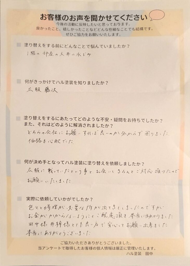 お客様の声 アンケート用紙が届きました。 1階の部屋の天井の水じみ 広報藤沢 どちらの会社にお願いすれば良いのか分からず困りました。 価格も心配でした。 広報に載っていたという事と、お会いしきちんとご対応頂けたので お願いいたしました。 色々と修... -