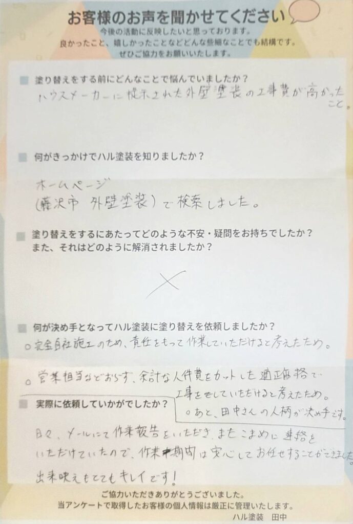 お客様の声 アンケート用紙が届きました。 ハウスメーカーに提示された外壁塗装の工事費が高かったこと。 ホームページ (藤沢市外壁塗装)で検索しました。 ❌ ○完全自社施工のため、責任をもって作業していただけると考えたため。 ○営業担当などおらず、余... -